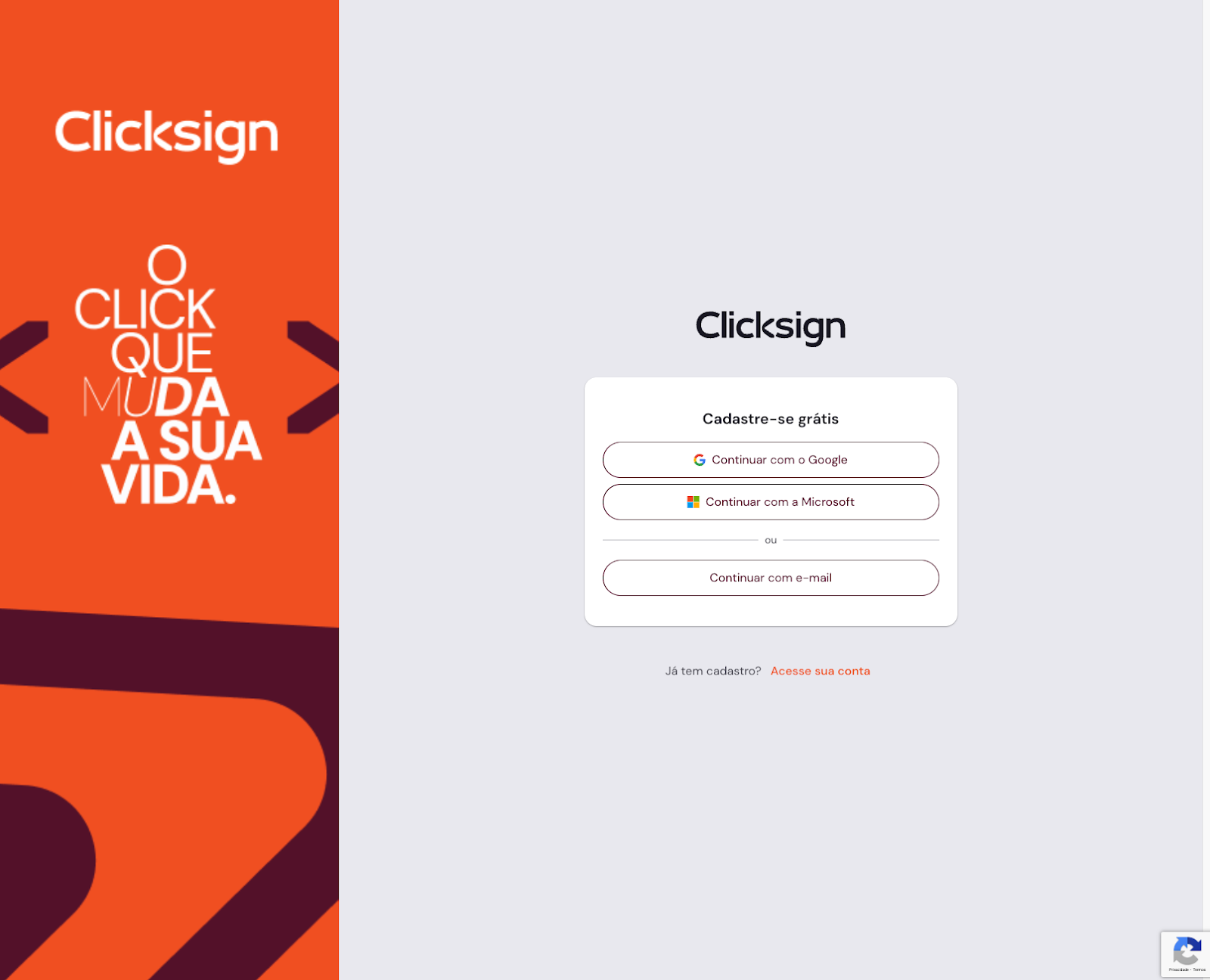 1. Para cadastrar uma conta no ambiente de testes, acesse o link: https://sandbox.clicksign.com/, clique em “Cadastre-se” e preencha seus dados normalmente.