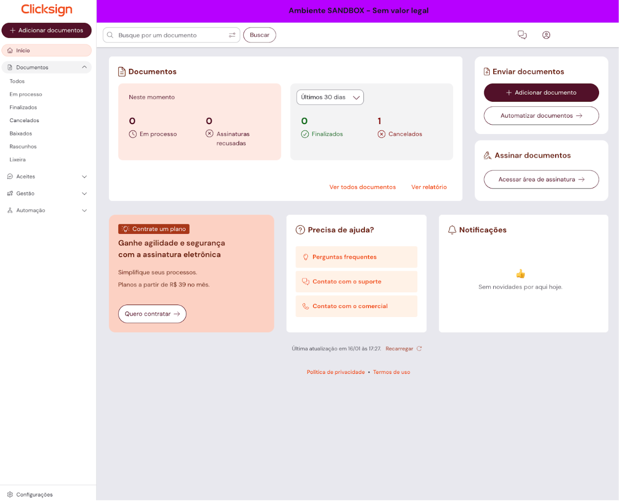 Para criar a sua conta neste ambiente, basta alguns cliques. Lembre-se de que ele não possui validade jurídica dos documentos enviados, e tem como propósito o desenvolvimento de testes técnicos dos usuários que utilizam a API.