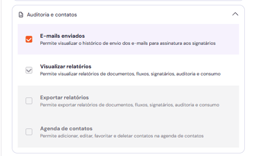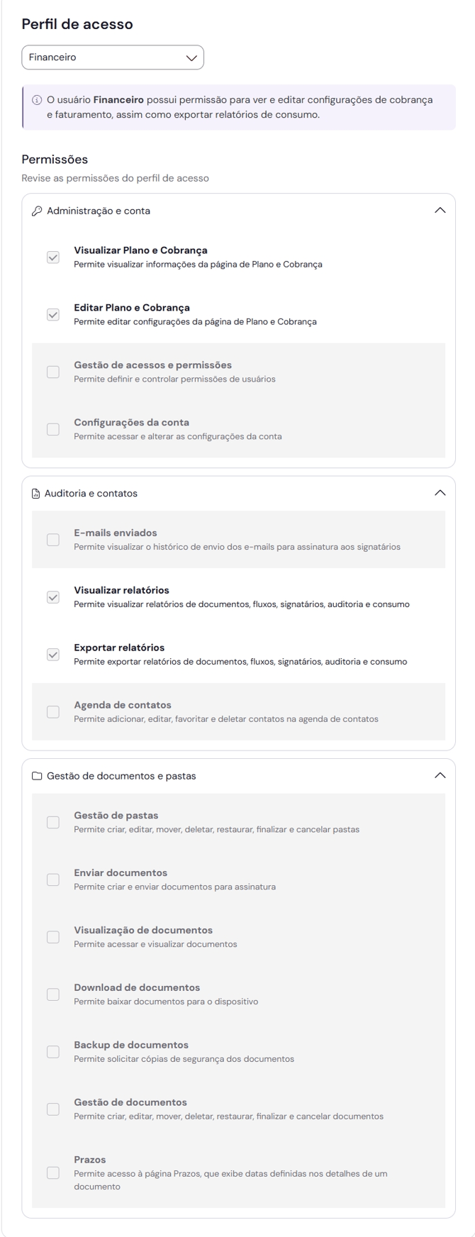 Elas são organizadas por módulos, como "Gestão de documentos e pastas", "Auditoria e contatos" e "Administração e conta" e o usuário pode clicar no cabeçalho de cada grupo para visualizar a lista detalhada de permissões que compõem aquele perfil.