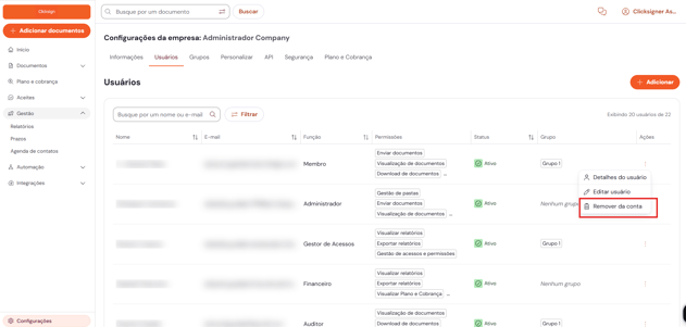 Na aba "Usuários", encontre o usuário desejado, clique em "Remover da conta" o usuário desejado e confirme em seguida, clicando em "Remover".