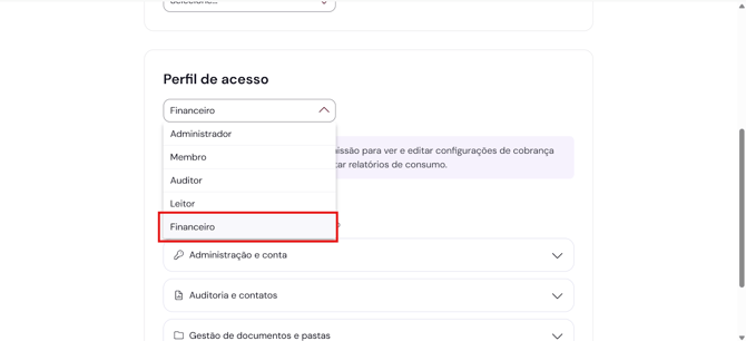 Em seguida, selecione o Perfil desejado, como no caso abaixo: “Financeiro” para que o usuário veja e edite funções de cobrança e faturamento.