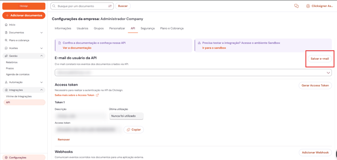 Em "E-mail do usuário da API" selecione um novo e-mail e clique em "Salvar e-mail"
