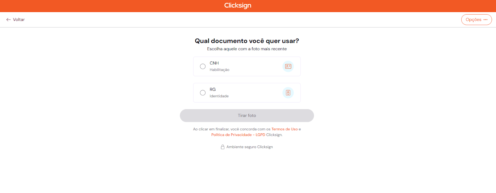 a) Nesta tela, selecione o documento a ser capturado (RG ou CNH);