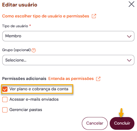 Depois disso, será necessário editar o usuário em questão de conceder o acesso a “Ver plano e cobrança da conta”.