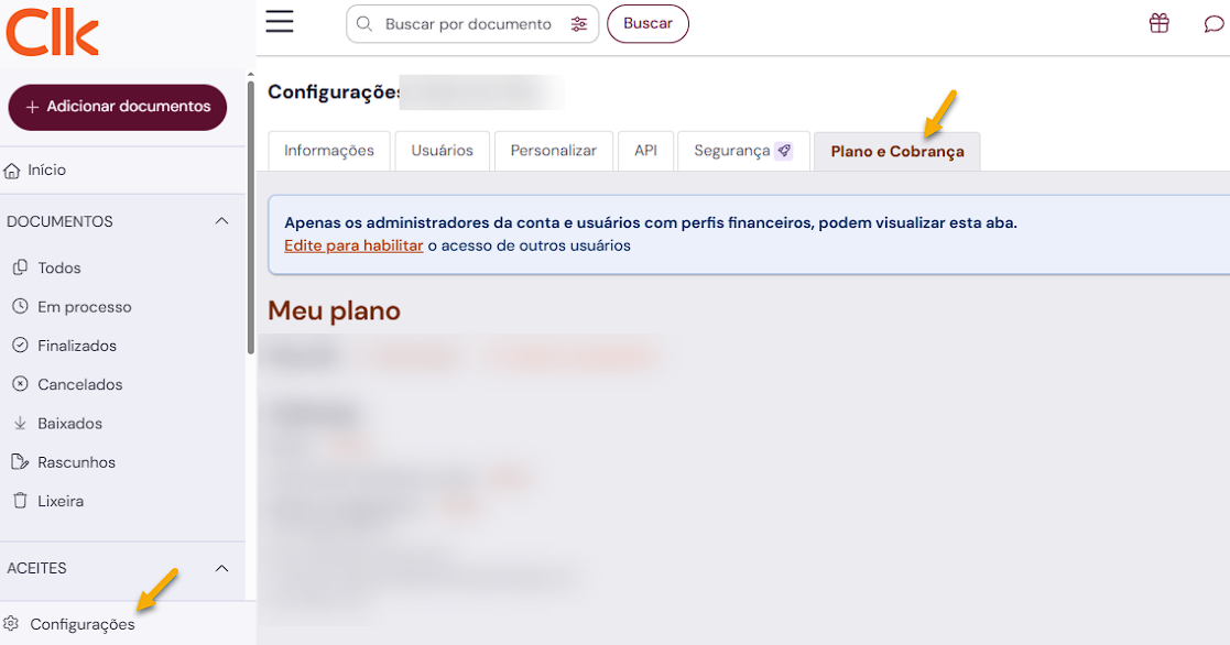 Assim, caso não tenha acesso à página de “plano e cobrança” você pode solicitar que um usuário administrador realize o ajuste das permissões de seu acesso para seu usuário, clicando em “configurações” e, então, em “usuários”.