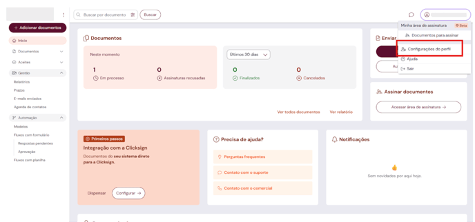 Obs: Não é possível alterar o e-mail do usuário. Para acessar uma conta Clicksign com outro e-mail, crie uma nova conta.