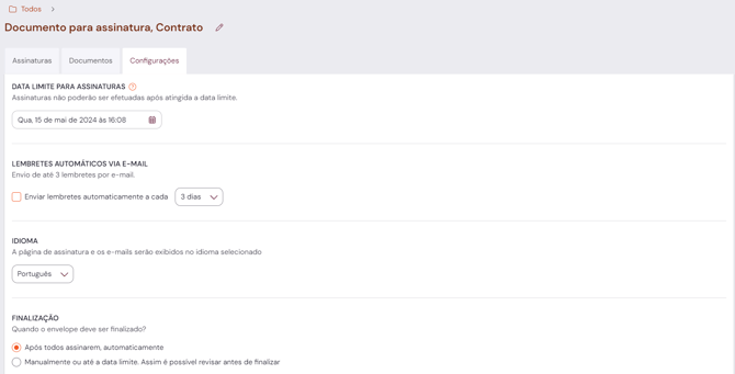 Os lembretes automáticos têm a recorrência definida para serem enviados a cada 3 dias, no máximo três vezes. Saiba mais sobre os lembretes e configurações do envelope