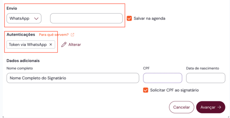 ⚠️ Importante: Caso algum desses critérios não seja atendido, o envio seguirá pelo fluxo padrão via link de assinatura no WhatsApp. Deste modo, poderá configurar o documento sem limitação de autenticação, seguindo o fluxo normal de envio.