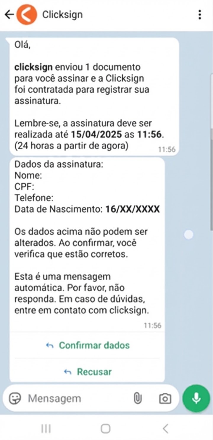 Nesta versão, ainda em Beta, a assinatura será 100% realizada via WhatsApp, caso os dados de nome, CPF e data de nascimento forem solicitados.