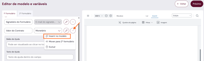 Para adicionar este campo no documento modelo, clique em opções, em seguida em "Inserir no modelo" e em seguida clique no documento onde deseja que o campo seja preenchido.