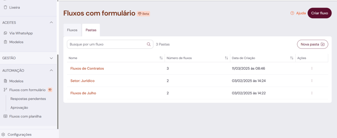 Na primeira tela, é possível visualizar todos os fluxos já configurados em formato de lista, organizados por nome, pasta, data de criação e status (ativo ou inativo).