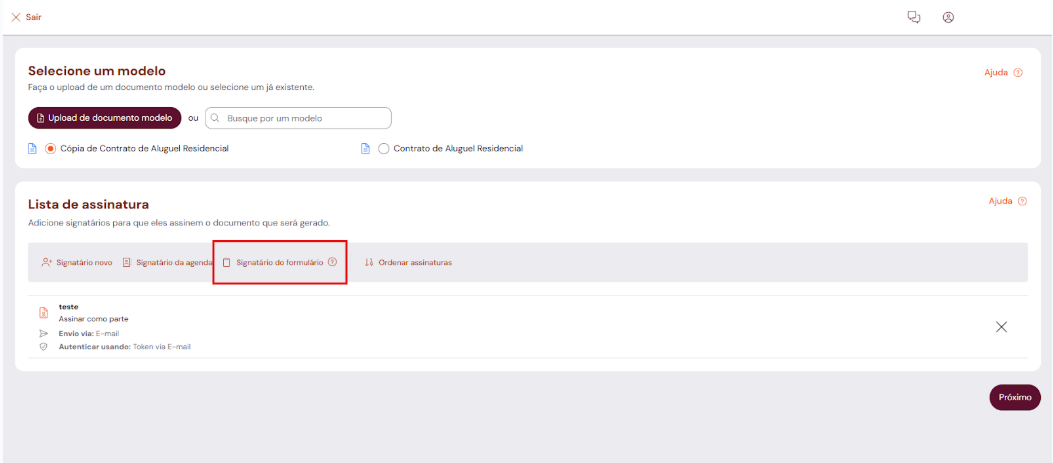 2. Siga os passos para a criação do Fluxo com formulário e, na etapa "Lista de assinatura" clique em "Signatário do formulário".