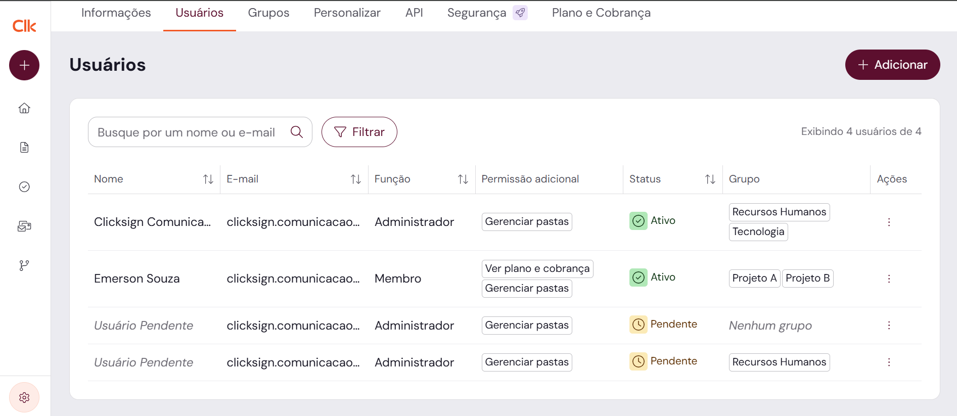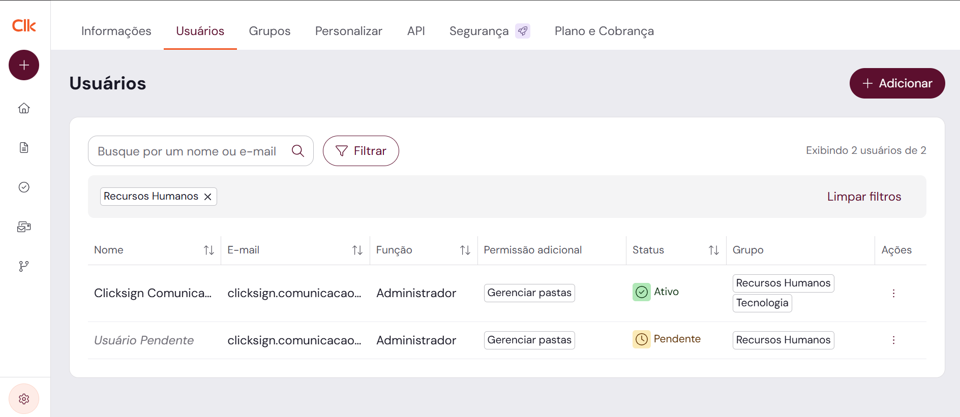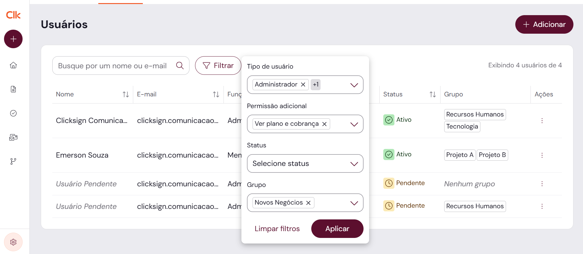 - Clique em “Filtrar” e escolha na lista os filtros desejados: "Tipo de usuário", “Permissão adicional”, "Status" e "Grupo".