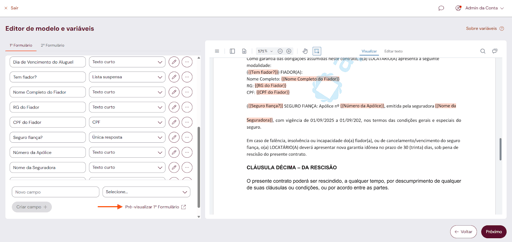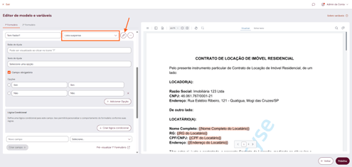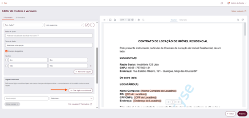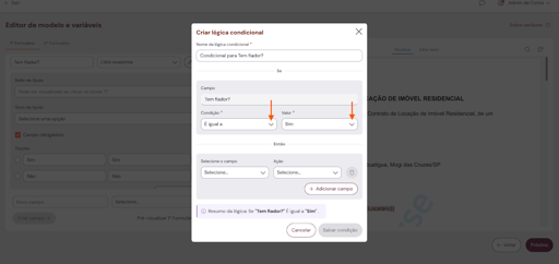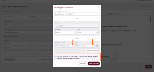 A regra configurada será descrita no modal, possibilitando que confere à lógica. (ex.: Se “Possui fiador?” é “Sim”, então Mostrar: Nome do fiador, CPF do fiador)