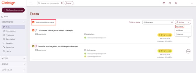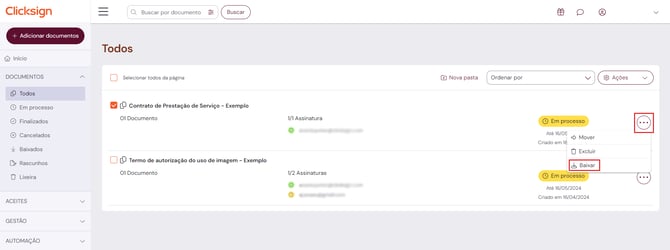 Na aba "Todos", é possível realizar o download de documentos individuais ou em massa. Para baixar um único documento, clique no ícone com reticências e depois em "Baixar".