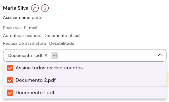 - Você será automaticamente adicionado como signatário de todos os documentos do envelope. Para mudar isso, basta clicar na seta dentro do campo com a listagem dos documentos e desmarcar aqueles das quais você não gostaria de assinar