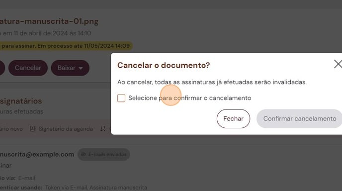 Neste caso, você pode optar por cancelar o documento, ou ainda, remover o signatário. Nos dois casos, o signatário perde o acesso ao documento.