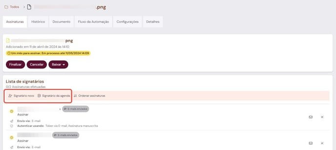 Para inserir um novo signatário, basta clicar em "Signatário novo" ou "Signatário da agenda".