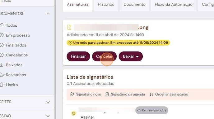 No menu lateral "Em processo", clique no documento que deseja cancelar e, em seguida, clique em "Cancelar".
