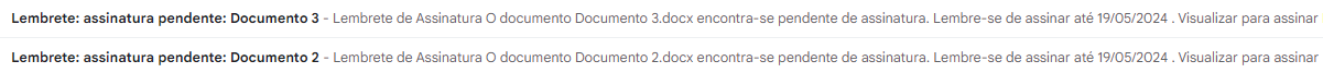 O assunto dos e-mails enviados para os signatários, sejam eles contendo documentos, tokens ou lembretes, é padrão, então não podem ser alterados.