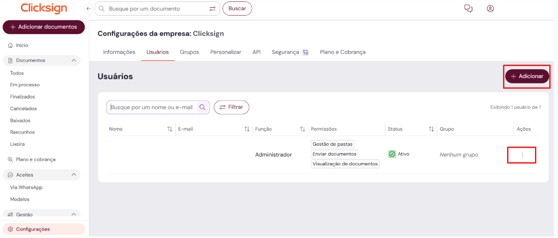 Para realizar essa ação, o usuário administrador deve configurar essa permissão, seja ao editar um usuário já cadastrado ou ao adicionar um novo. Confira o passo a passo: