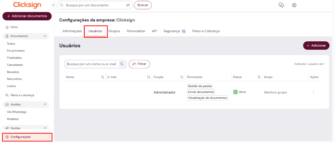 1. Clique em "Configurações" no menu lateral e acesse a aba "Usuários":