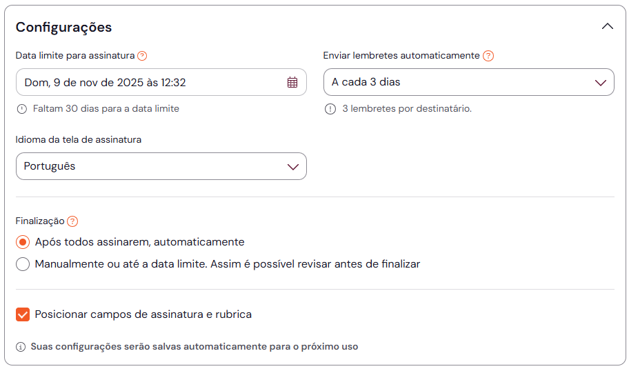 1. Na etapa de Configurações, durante o envio do envelope, selecione a opção “Posicionar campos de assinatura e rubrica” e clique em “avançar”, ao final da página.