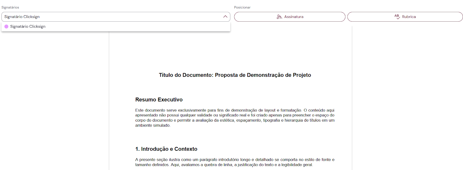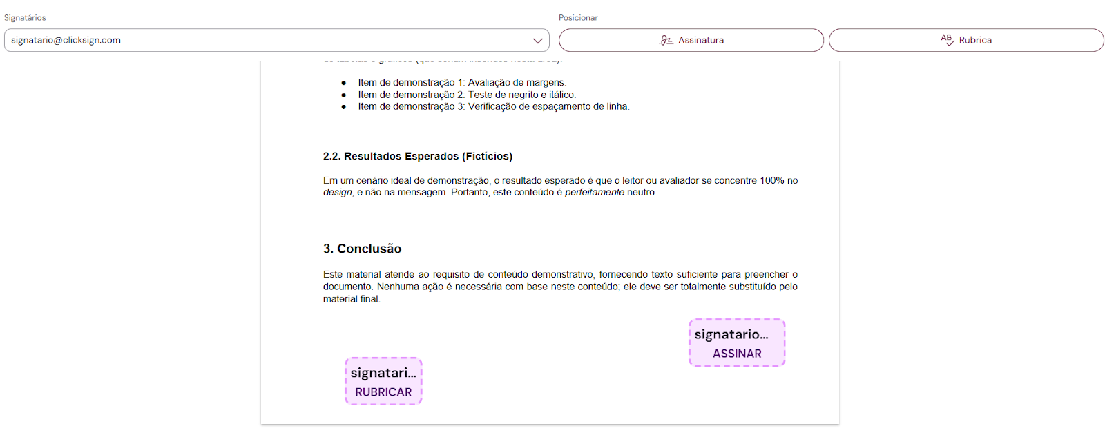 3. Posicione o campo no local desejado. Repita o processo para os outros signatários e documentos que deseja posicionar a assinatura e/ou rubrica.