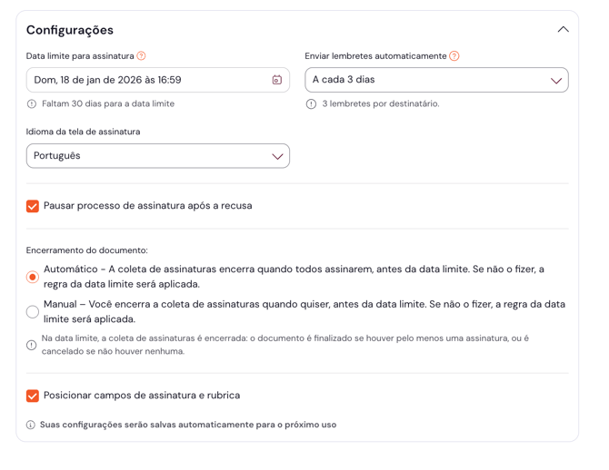 Se houver mais de um signatário e você precisar que um assine antes do outro, ative a Ordem de Assinaturas e capture os nomes para a sequência desejada. Ordenar assinaturas.