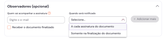 Informe o e-mail do Observador e preencha as configurações para notificar pessoas (dentro ou fora da empresa) sobre o status das assinaturas em tempo real.